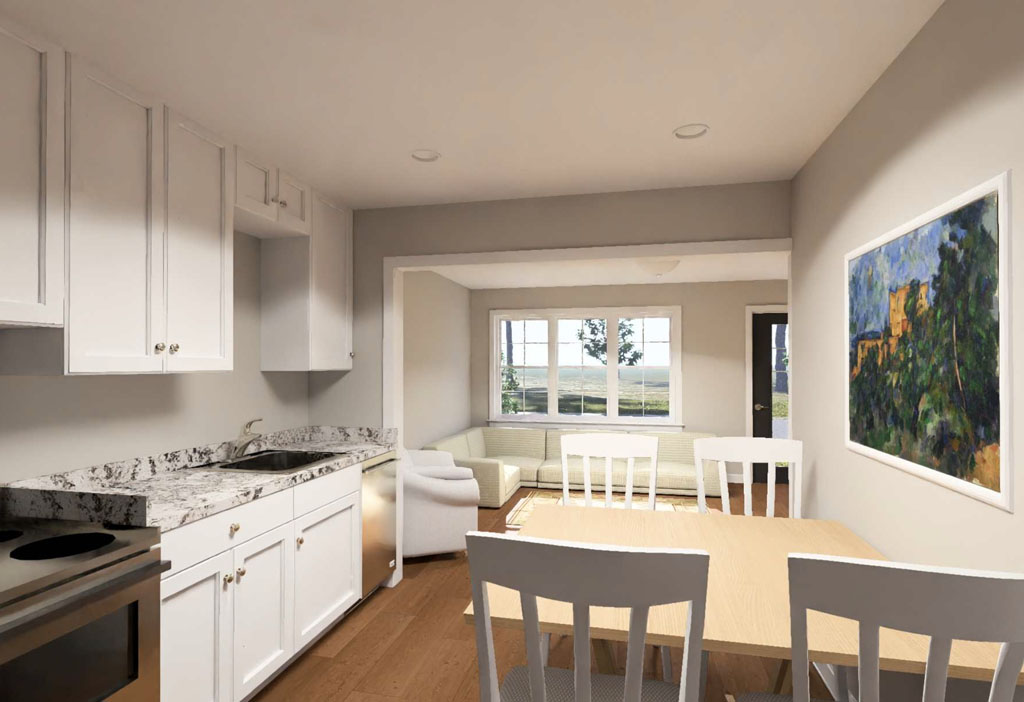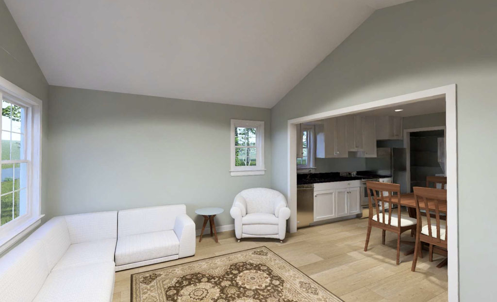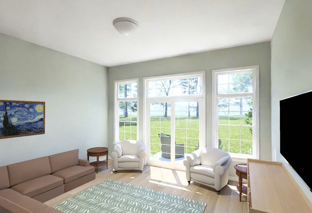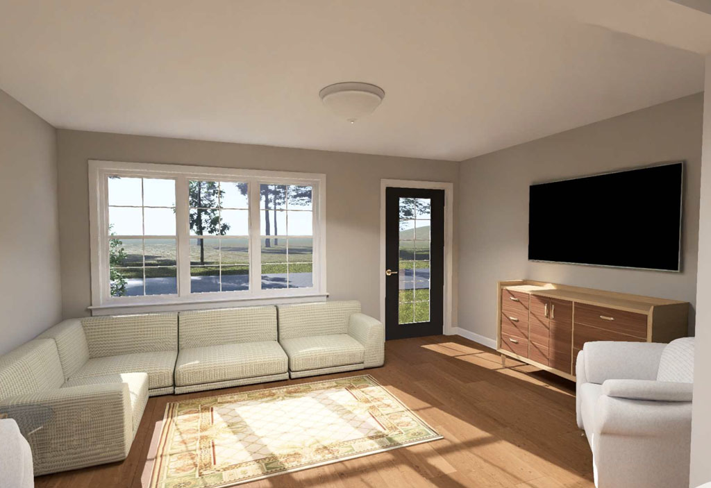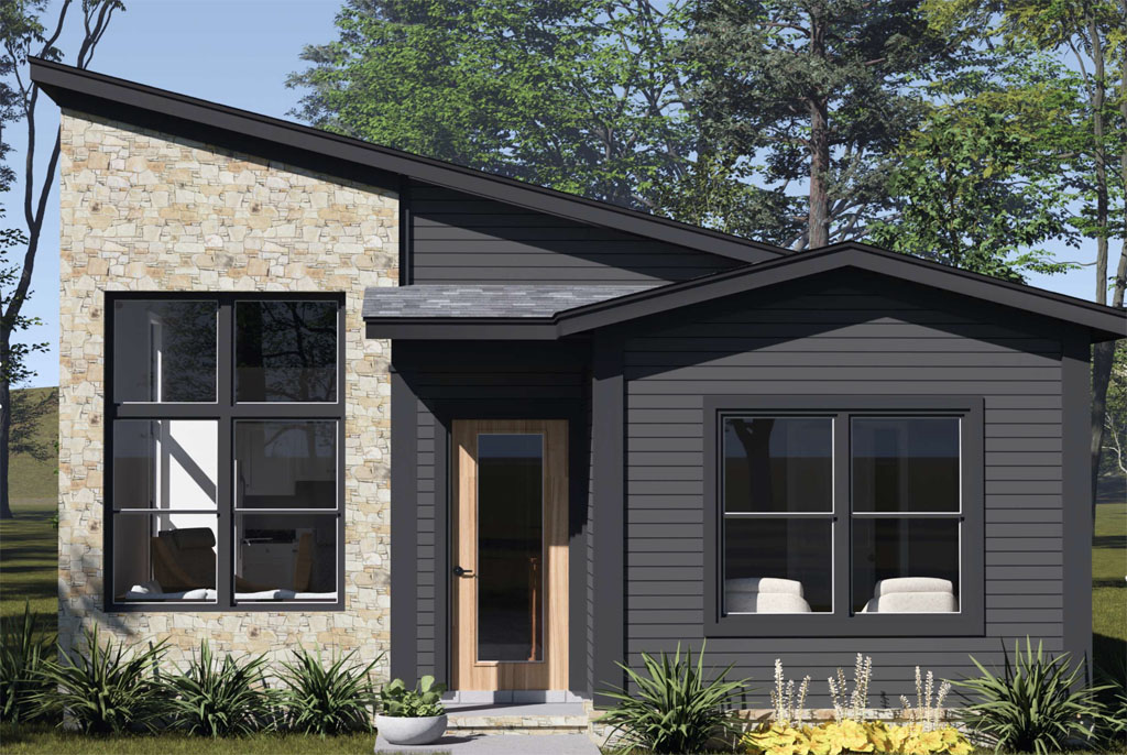 The Harborstone Point #24648 offers the same efficient 1,011-square-foot layout with 2 bedrooms and 2 full bathrooms, but gives buyers a different look from the street. Its distinct front elevation, complete with three front windows and a double-door entry, gives the plan fresh curb appeal while keeping the same smart interior arrangement. Inside, the front living room opens into a centrally placed kitchen with a large island, and the side dining area keeps the layout connected and easy to enjoy. The pantry-laundry zone near the kitchen adds even more everyday function, while the rear primary suite delivers privacy, a full bath, and a walk-in closet. For buyers who want compact efficiency with a slightly different exterior personality, Harborstone Point is an appealing choice.