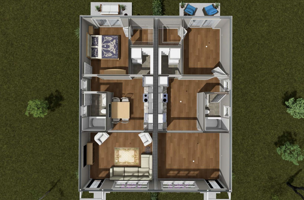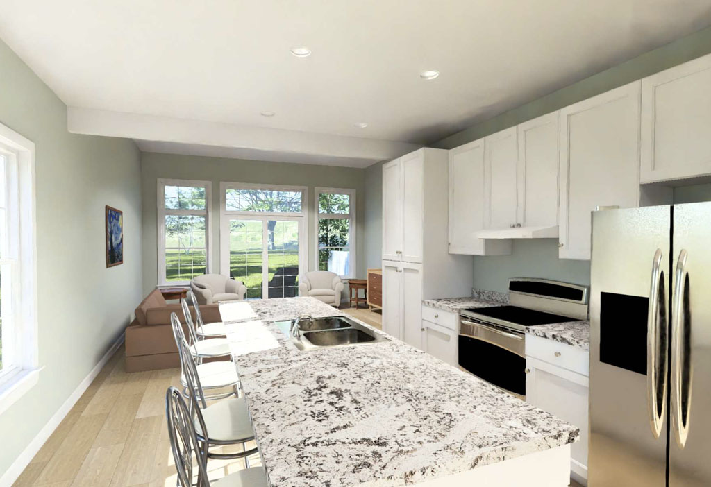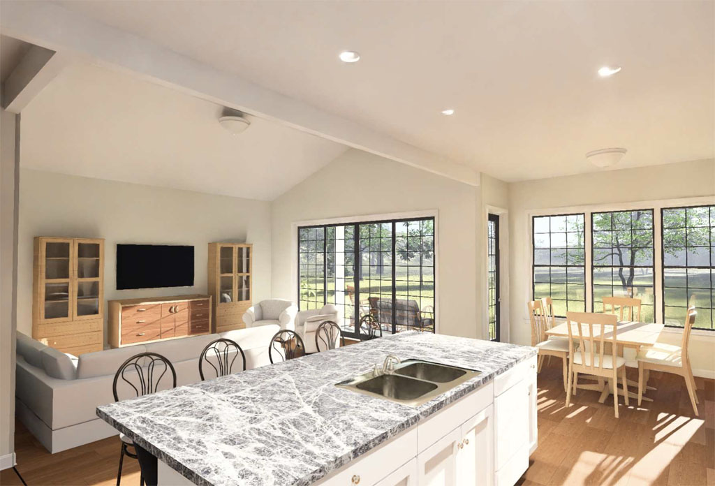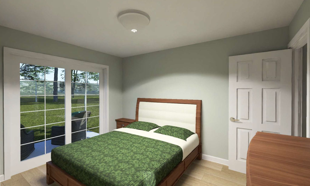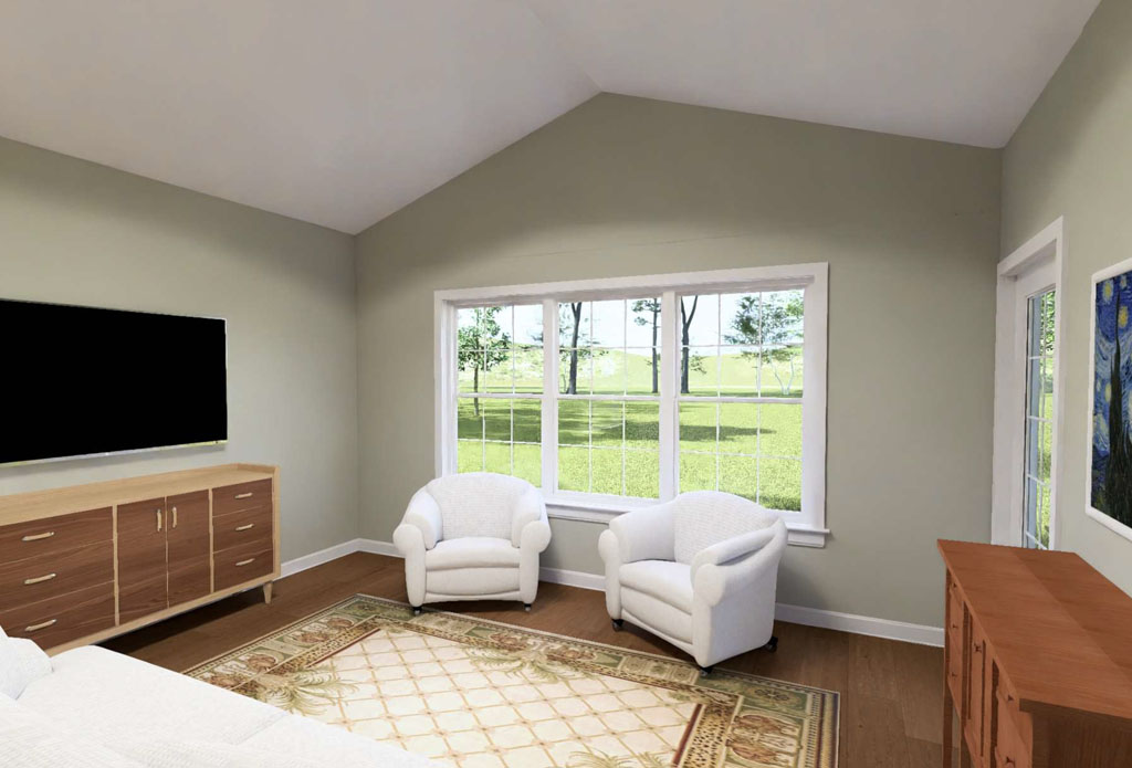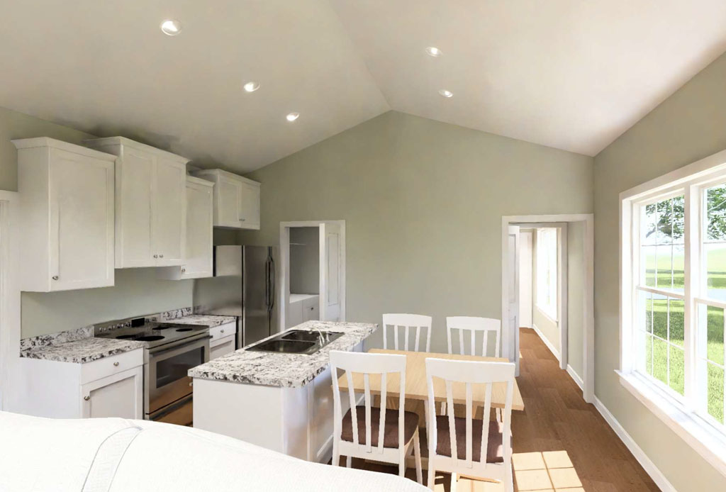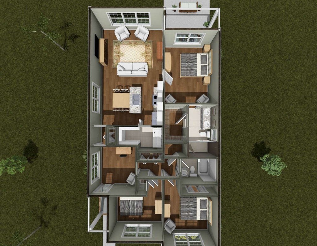 For those who need more bedroom count without moving above 1,500 square feet, the Golden Meadow #24615 stands out. This one-story home offers 1,352 square feet with 4 bedrooms and 3 full bathrooms, making it especially attractive for families, roommates, rental properties, or developers looking for high-value layouts. A modern slanted roofline gives the exterior a contemporary edge, while inside the home opens from the living room to a kitchen with a small island and on to an offset dining area, pantry zone, and nearby laundry room. One of the biggest advantages of this design is the fourth bedroom with its own full bathroom, created in place of traditional garage space. That added flexibility makes Golden Meadow an excellent fit for multigenerational use, guest accommodations, or private work-from-home living.