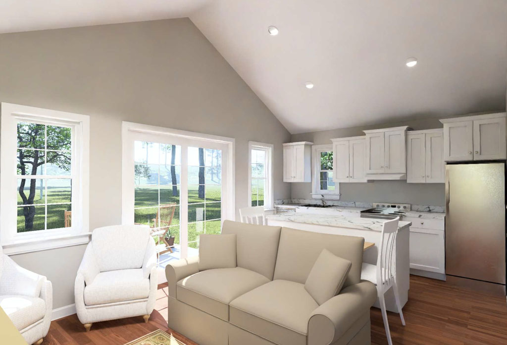 The Briar Ridge #24610 is another compact design that brings unusual value to the under-1,500-square-foot category. With 799 square feet, 2 bedrooms, 2 full bathrooms, and an attached 1-car garage, it offers features many buyers do not expect in a home this size. The interior centers on an open-concept living room connected directly to the kitchen, where a built-in sitting area supports casual dining and a dedicated pantry-cabinet wall adds practical storage. The rear bedroom works as a private suite with its own full bathroom, while the front bedroom sits near a second full bath, making the plan ideal for guests, roommates, or a home office setup. The attached garage adds even more function with secure parking and extra storage.