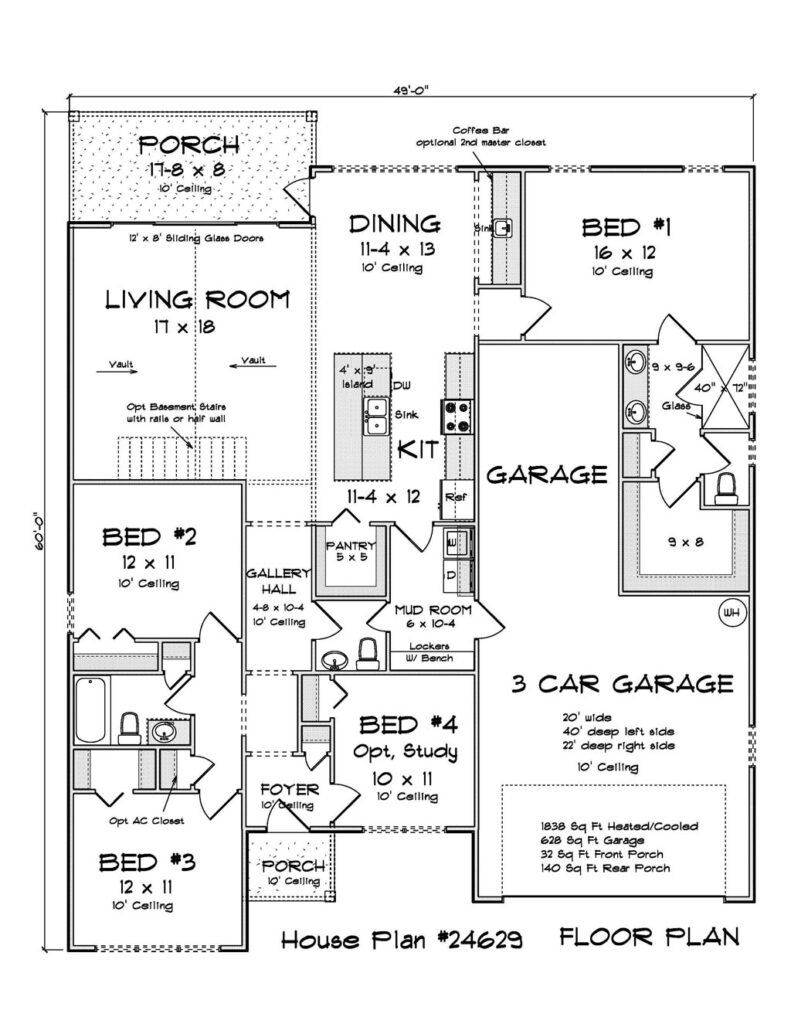 If your next community needs one story house plans that balance affordability, family-friendly features, and showroom appeal, Plan #24629 is a practical, proven direction: 1,838 square feet, 4 bedrooms with an optional study, 2.5 bathrooms, a tandem 3 car garage, and the kind of livable layout that buyers can grow into for years.